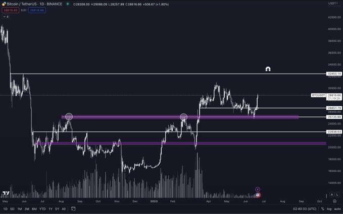 Nhà phân tích nói rằng luận điểm tăng giá của anh ấy dựa trên thực tế là Bitcoin đã ghi nhận mức thấp cao hơn ở mức giá 25.000 đô la và cũng tôn trọng mức 26.700 đô la.