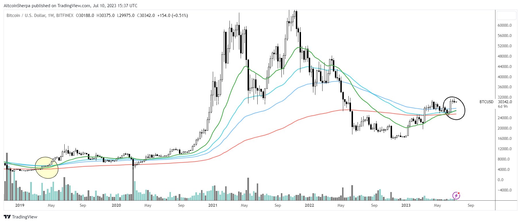 Nhà giao dịch nói rằng hành động giá của Bitcoin trên biểu đồ khung thời gian hàng tuần có vẻ tăng giá, nằm trên các đường trung bình động hàm mũ (EMA) chính của nó, giống như nó đã xảy ra vào năm 2019.