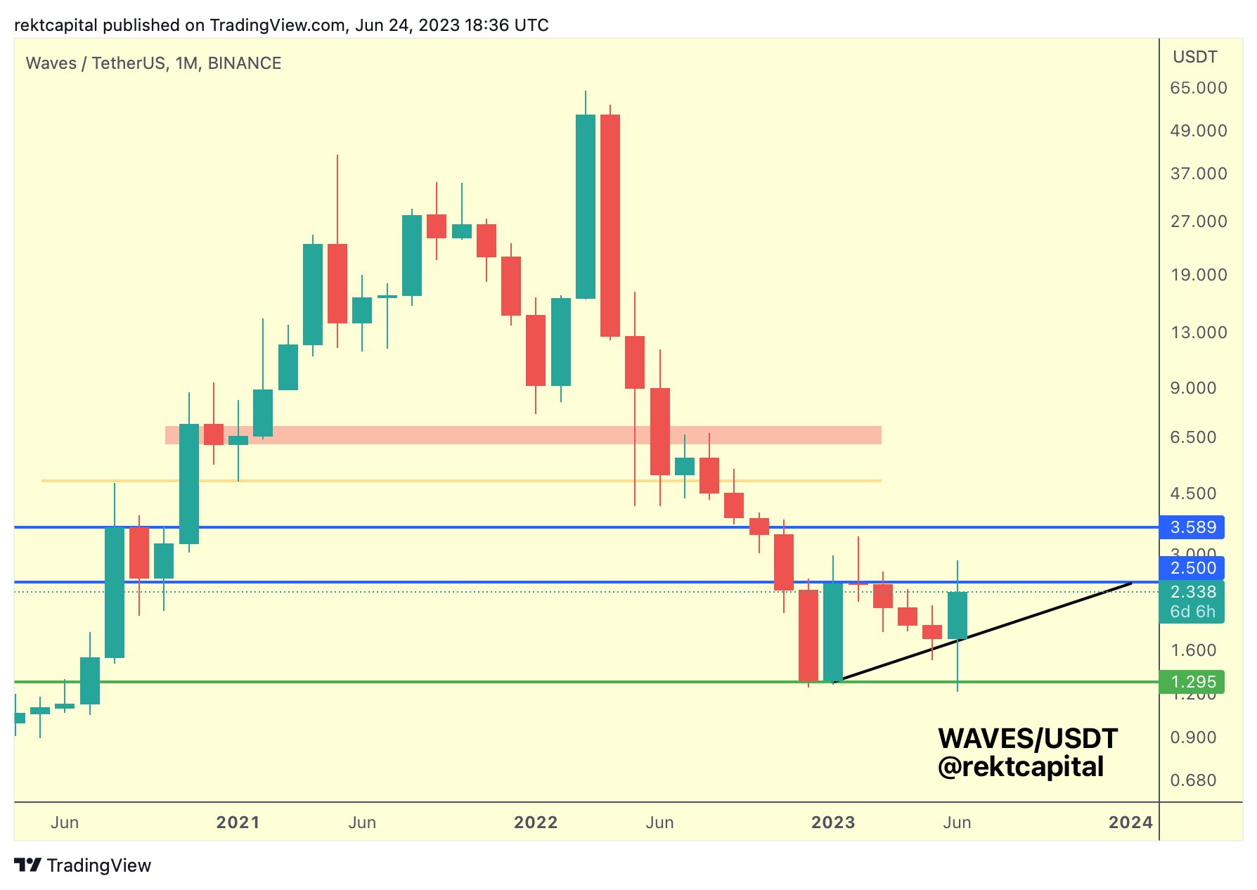 Tiếp theo là Waves (WAVES), một giao thức tập trung vào việc tạo mã thông báo và ứng dụng phi tập trung (DApp). Theo Rekt Capital, WAVES có thể sắp chạm đáy trên biểu đồ hàng tháng vì nó tạo ra một mô hình tam giác. Rekt cho biết đáy có thể được xác nhận nếu WAVES vượt qua mức kháng cự $2,50.