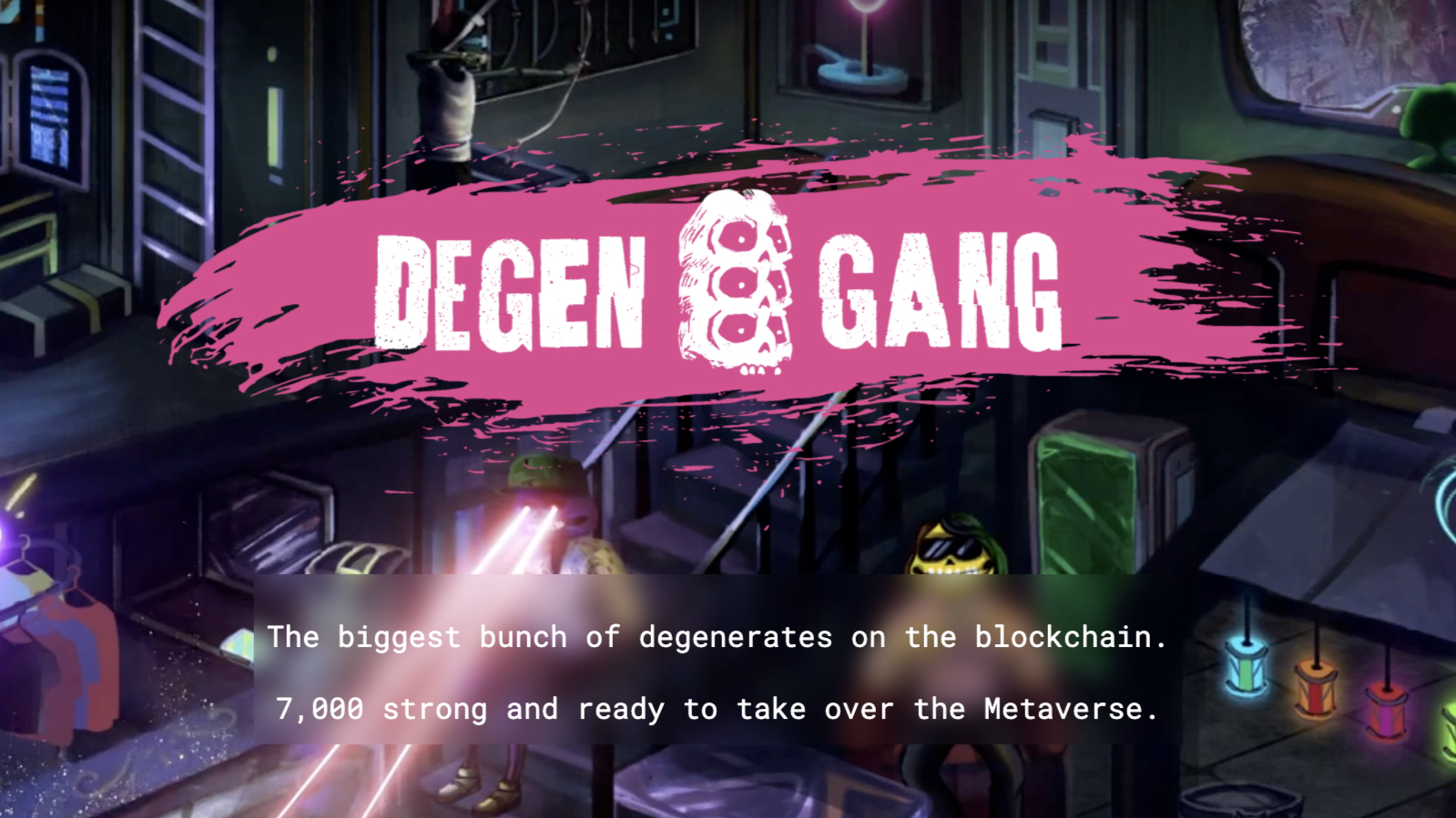 Degen Gang là một metaverse xã hội kết hợp trò chơi Play-to-Earn và nó cũng là một bộ sưu tập đã bán hết của 7000 NFT dựa trên lập trình được gọi là degens . Degen Gang NFT cấp cho chủ sở hữu quyền vào Degen Bar ảo với hangout, Bar Fights (trò chơi NFT arcade P2E), trò chơi poker, sự kiện, cửa hàng và hơn thế nữa.