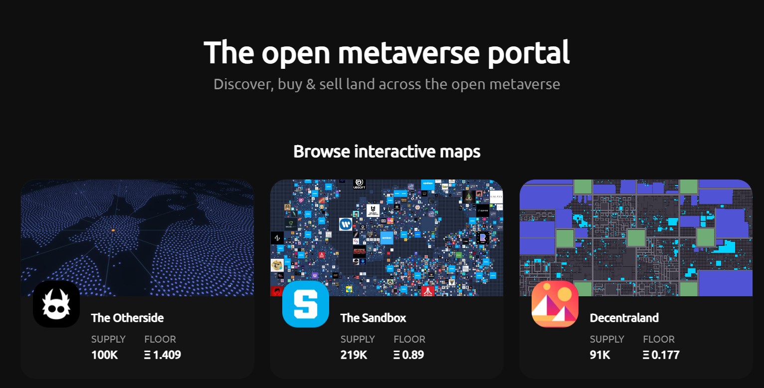 • Duyệt các bản đồ tương tác cho The Otherside, Decentraland, The Sandbox và nhiều bản đồ khác.