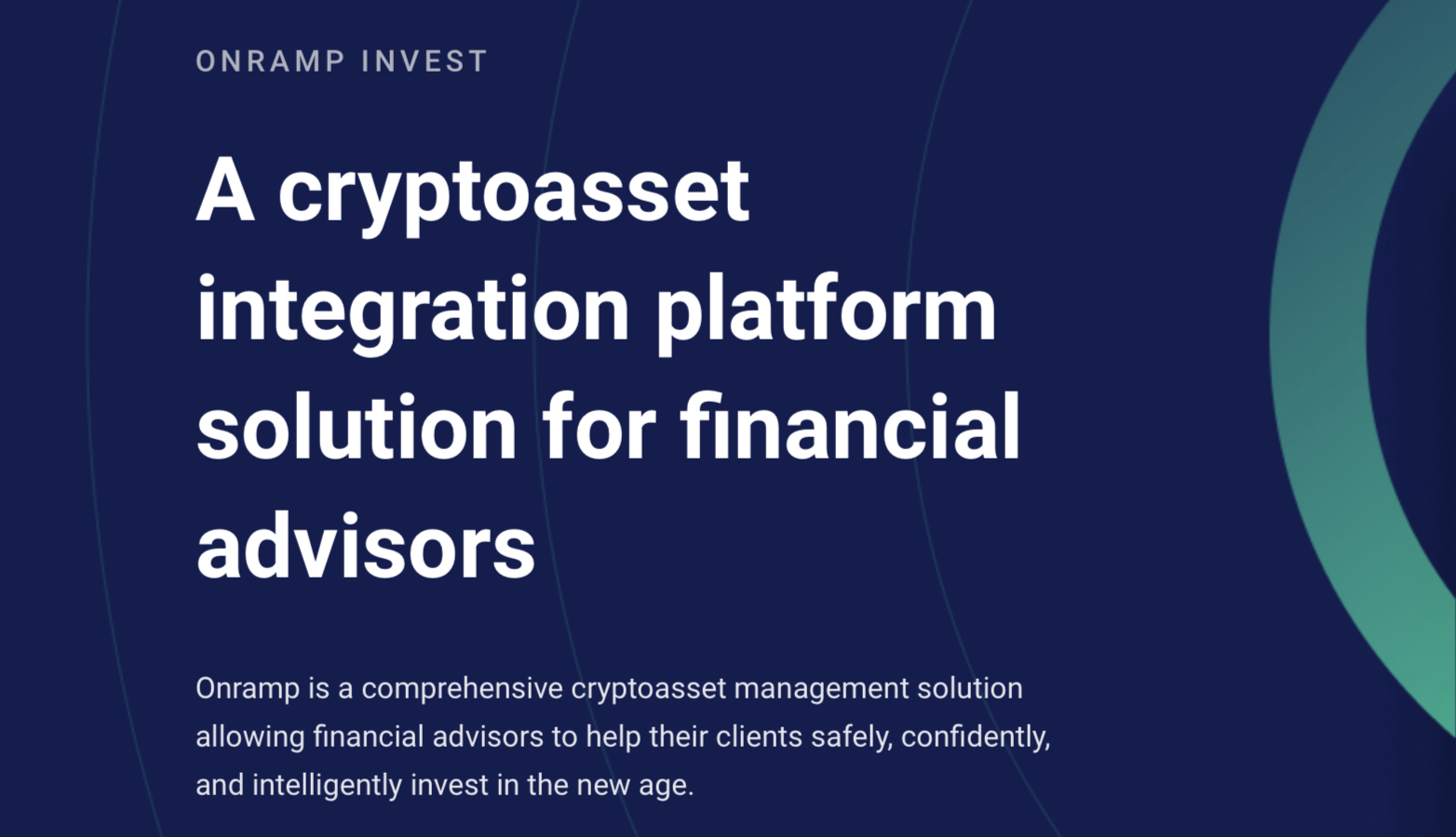 Onramp Invest  cho phép các cố vấn tài chính tiếp cận với những người giám sát tiền điện tử đẳng cấp thế giới cung cấp giao dịch, tái cân bằng, báo cáo và thanh toán mà không cần rời khỏi quy trình công việc hiện có của họ.