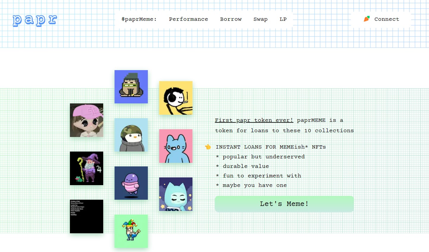 PaprMEME là một giao thức cho vay NFT được cung cấp bởi Uniswap V3. Nền tảng áp dụng một cơ chế mới được xây dựng xung quanh mã thông báo gốc của nó. Papr được đúc bởi những người đi vay, những người chuyển một số tài sản thế chấp sang bộ điều khiển papr (một hợp đồng thông minh). Sau đó, người vay có thể đổi papr của họ lấy các tài sản khác bằng cách sử dụng một sàn giao dịch phi tập trung (ví dụ: Uniswap).