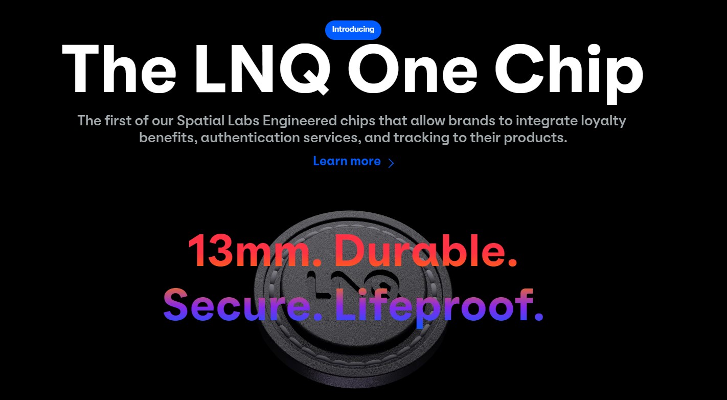 Spatial Labs LNQ là một công ty cơ sở hạ tầng phần cứng/phần mềm trong ngành cung cấp năng lượng cho thế hệ công nghệ Web3 tiếp theo. Sản phẩm đầu tiên của nó, LNQ, một nền tảng phần cứng sáng tạo hỗ trợ chuỗi khối, đã được ra mắt công chúng vào tháng 5 năm 2022. LNQ One Chip, một vi mạch 13 mm độc quyền, cho phép bất kỳ mục nào được thu nhỏ thành tài sản kỹ thuật số có thể theo dõi trên chuỗi khối và cung cấp cho chủ sở hữu một sổ cái kỹ thuật số theo dõi tính xác thực, nguồn gốc, lịch sử quyền sở hữu, giá trị theo thời gian thực của một mặt hàng vật lý và cho phép các lợi ích gia tăng như khuyến khích khách hàng thân thiết, thông tin chi tiết nâng cao, v.v.