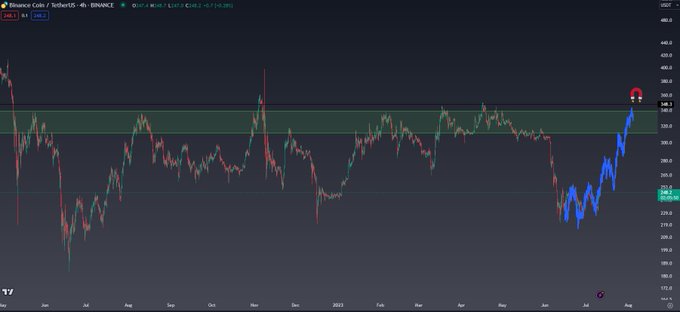 Theo biểu đồ của Kaleo, BNB có thể quay lại mức giá 300 đô la và có khả năng đạt mức cao nhất trong tháng 4 là trên 340 đô la một chút vào khoảng 4 tháng cuối năm 2023. BNB trở lại $300.